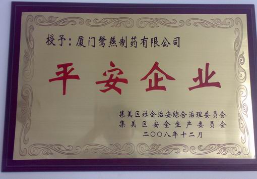 近日,集美區(qū)召開(kāi)了“2008年度平安企業(yè)”表彰大會(huì),廈門(mén)鷺燕制藥有限公司從幾百家參評(píng)企業(yè)中脫穎而出,獲此殊榮。